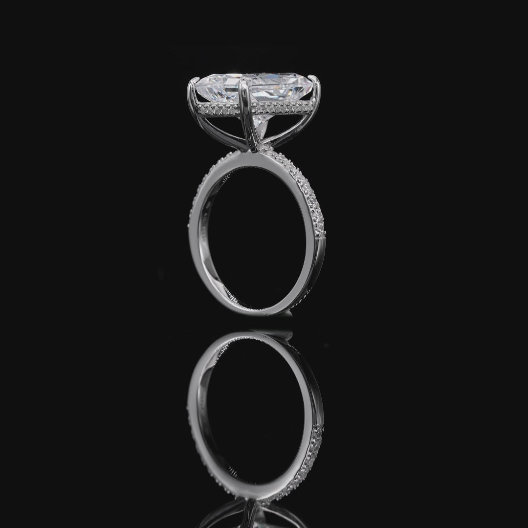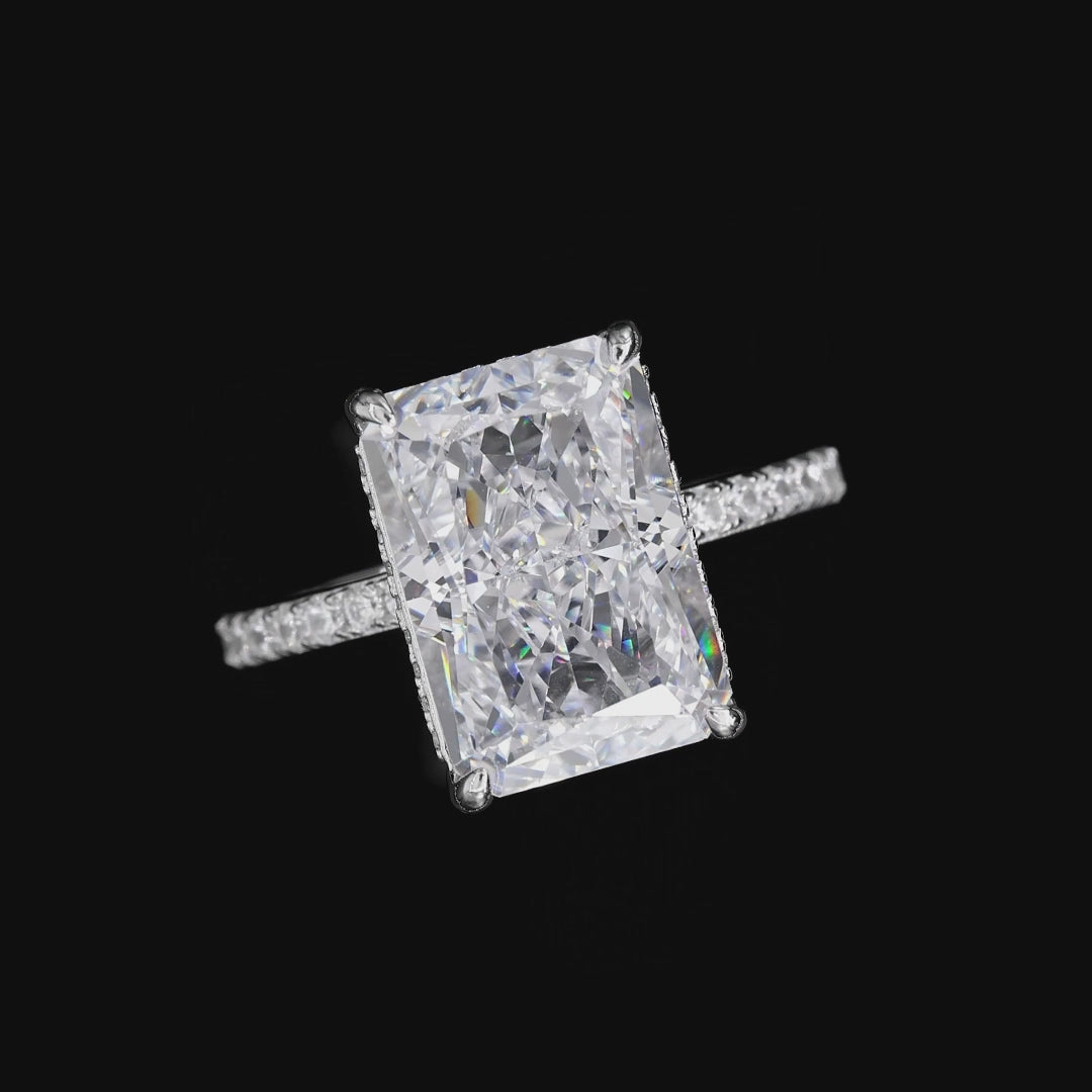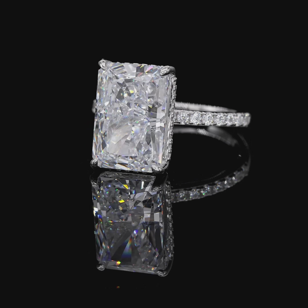 Turn heads with our sexy Angelina Radiant Cut ring, showcasing a sleek ultra skinny band, featuring a stunning 6 carat diamond crystalline center stone.
