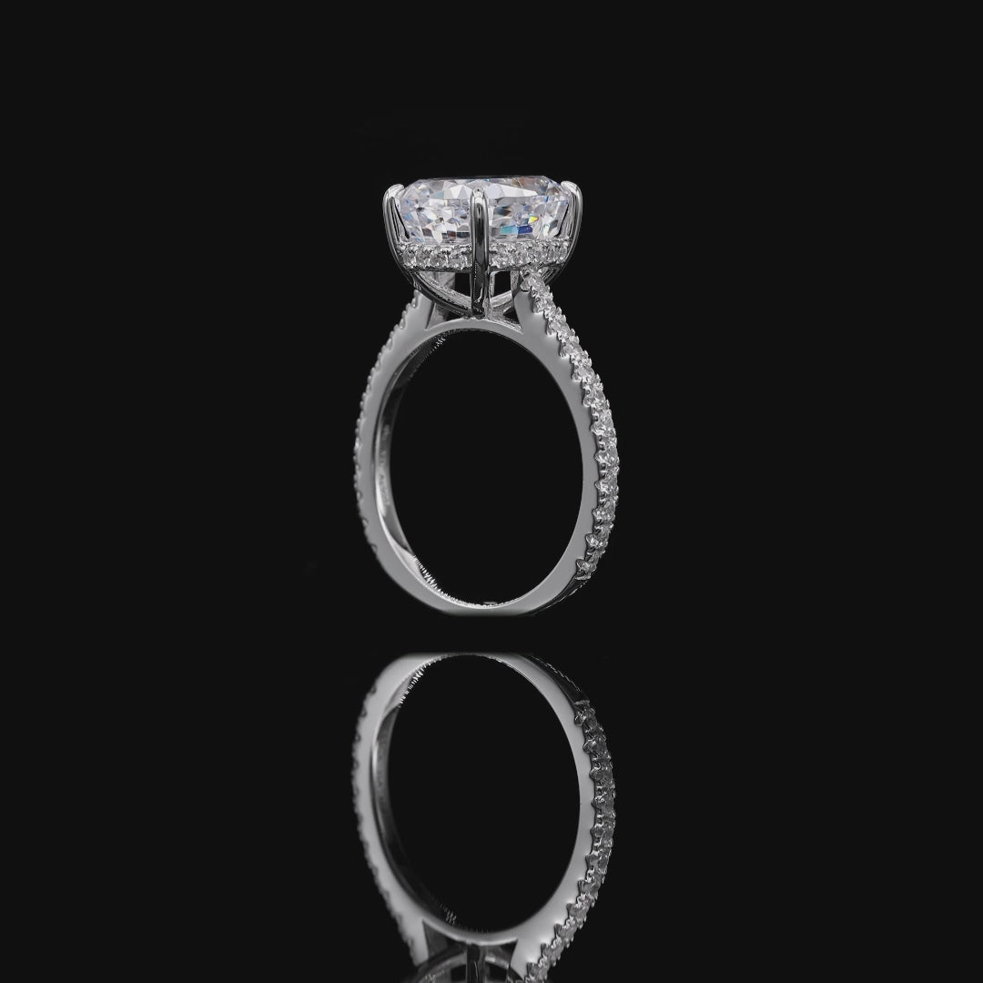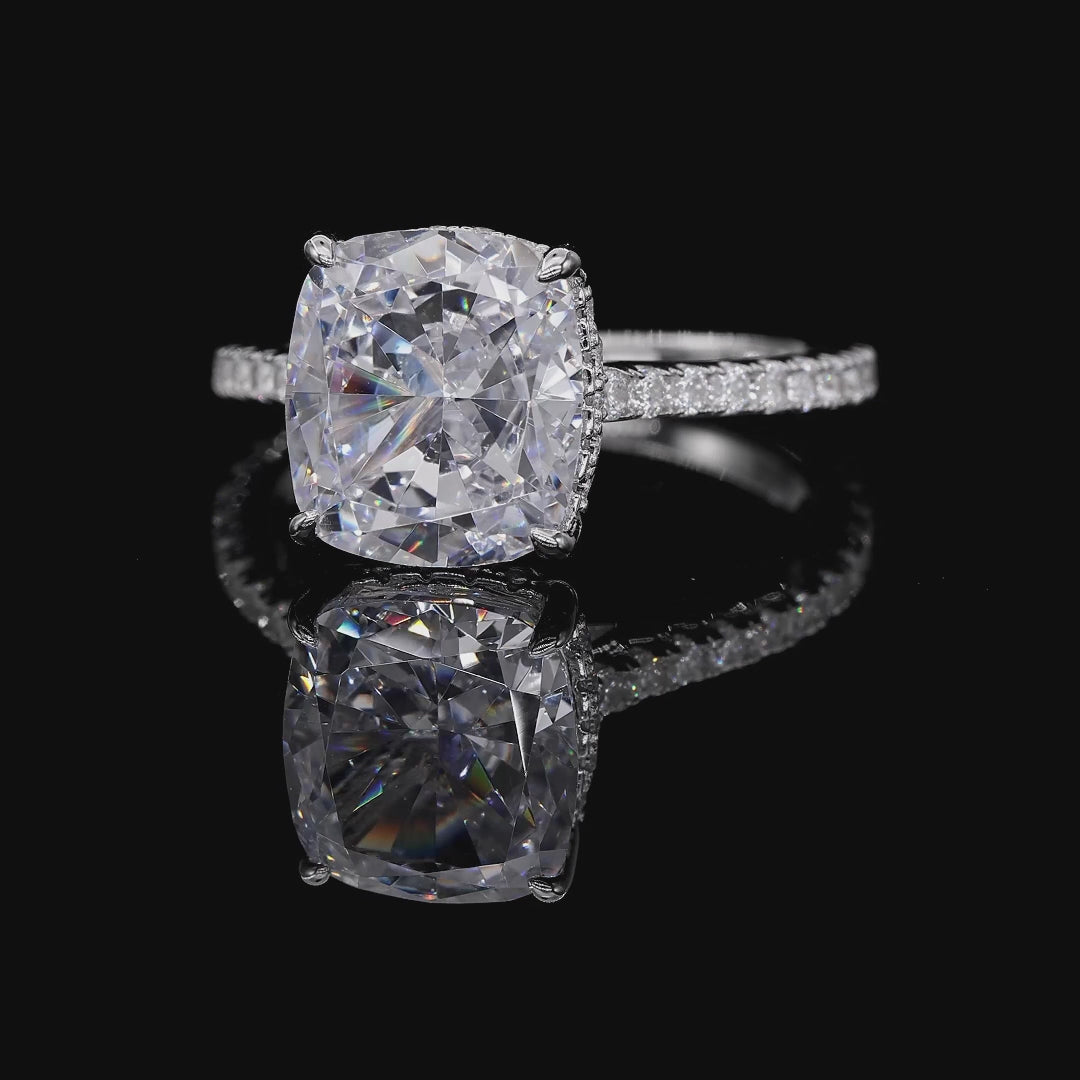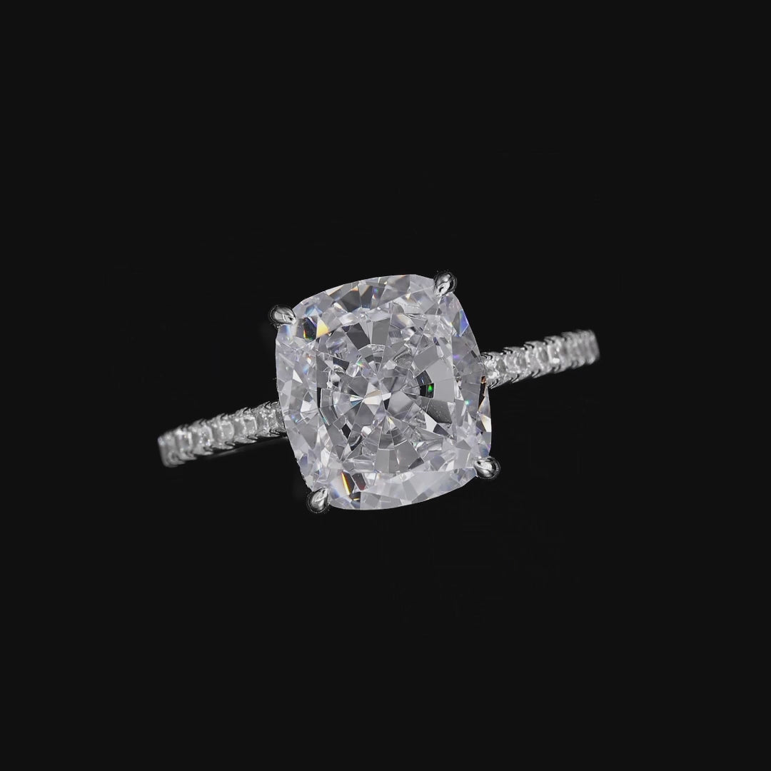 Sparkle brighter with our gorgeous skinny engagement ring, featuring 4.5 carat cushion shaped center stone, surrounded by a micro pave set diamond crystalline on the sides.