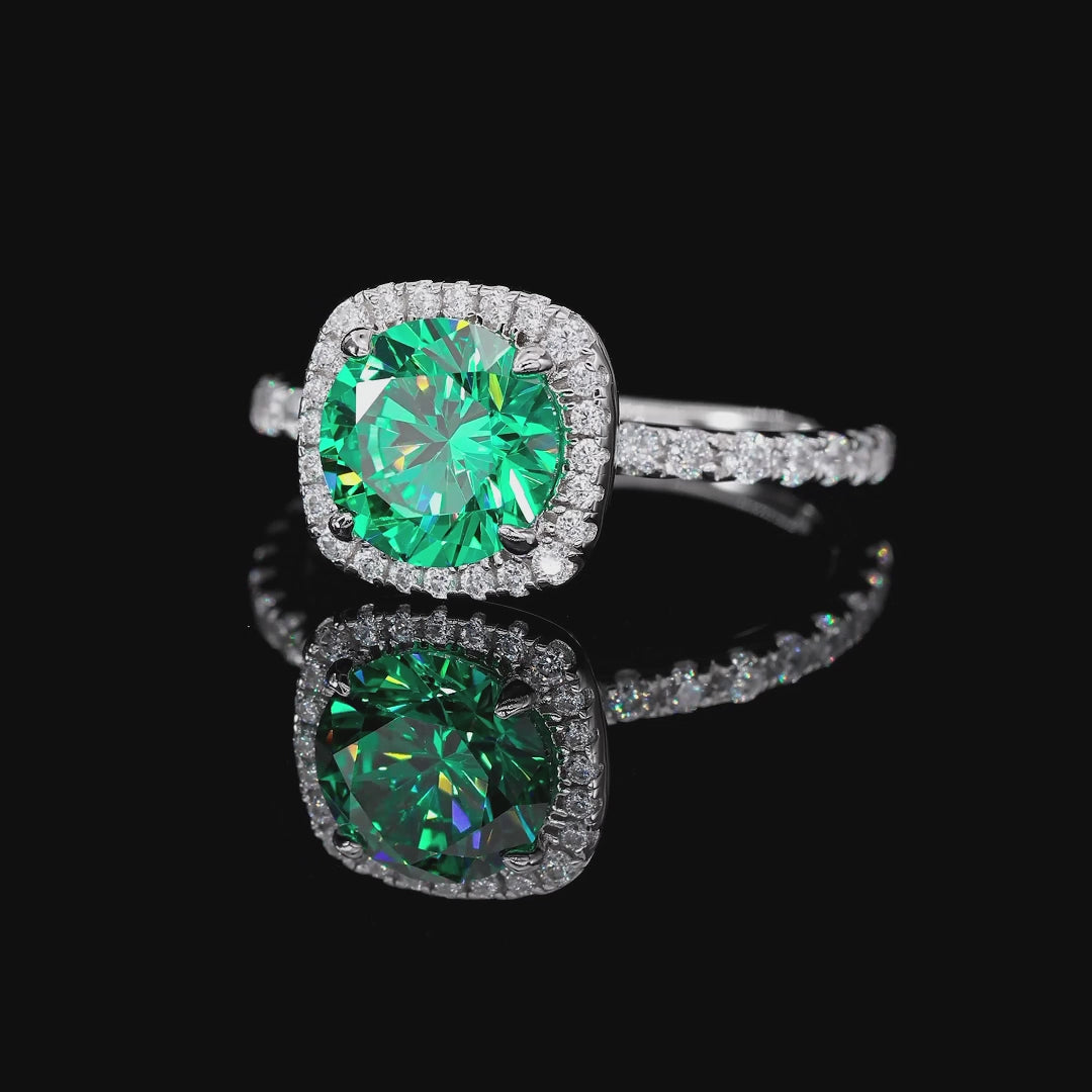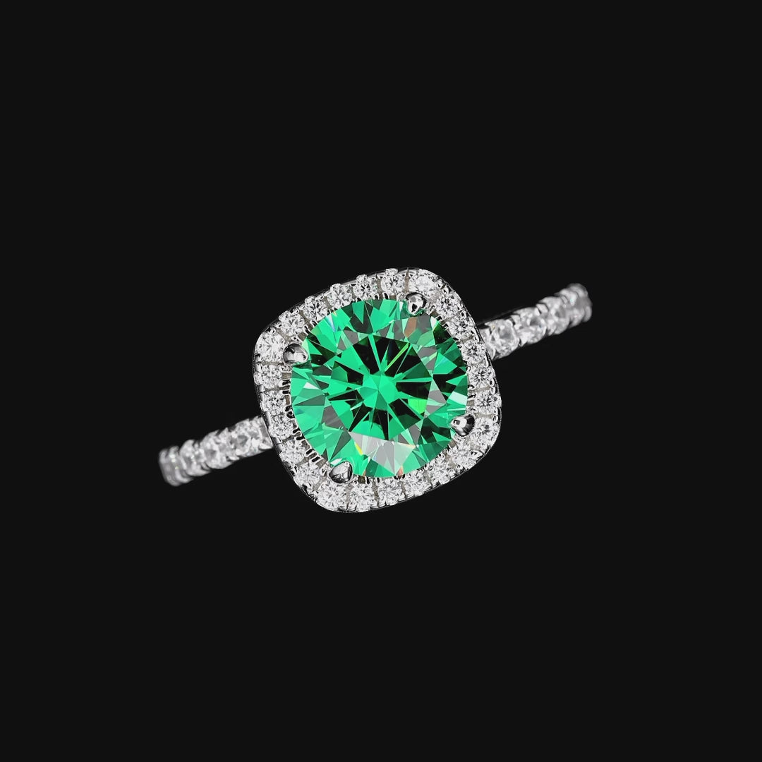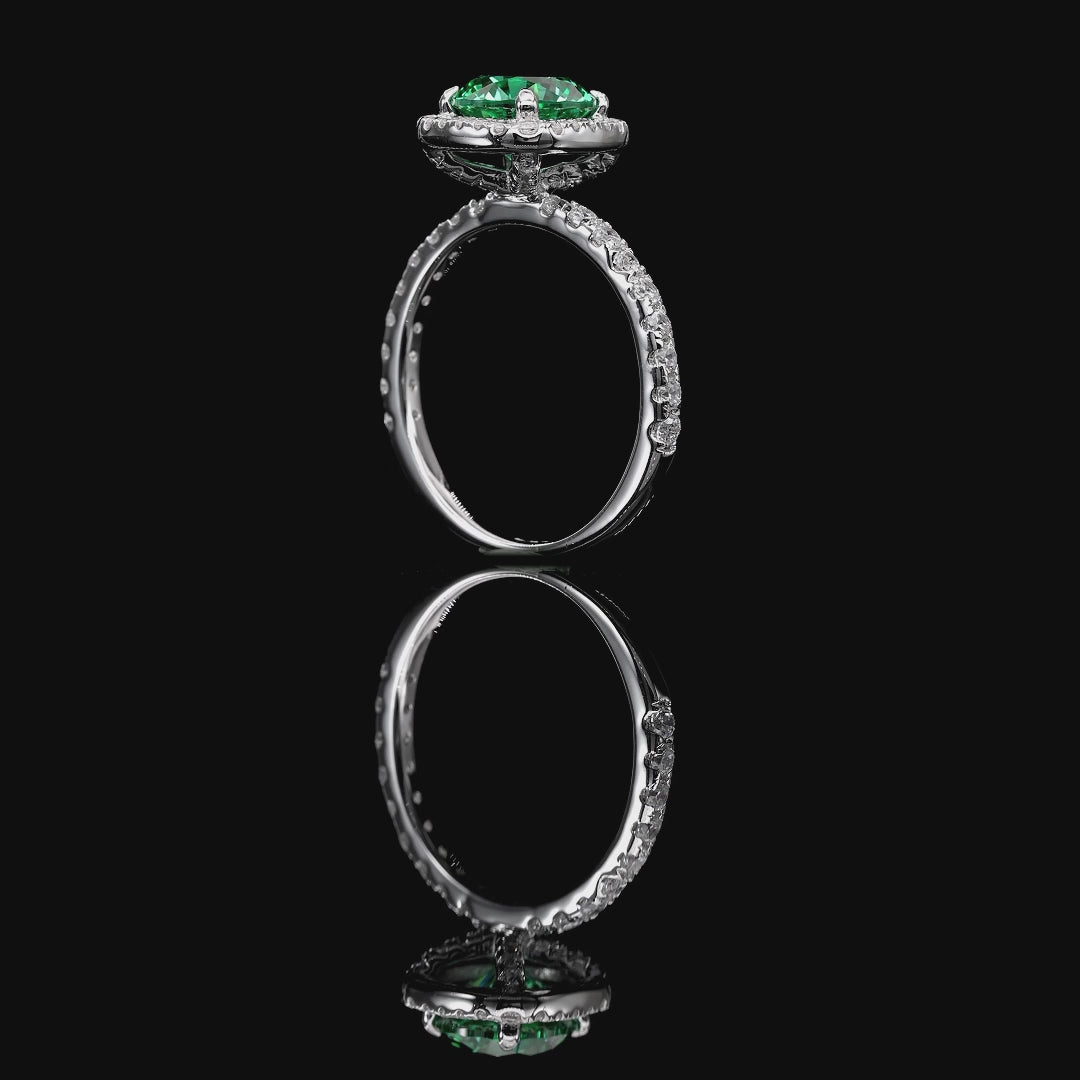 Stunning 2 carat Paraiba Crystalline center stone shimmers with electric green brilliance, set in a sleek skinny band, surrounded by a halo of sparkling accents. This ring brings a modern spin to any traditional halo jewelry.