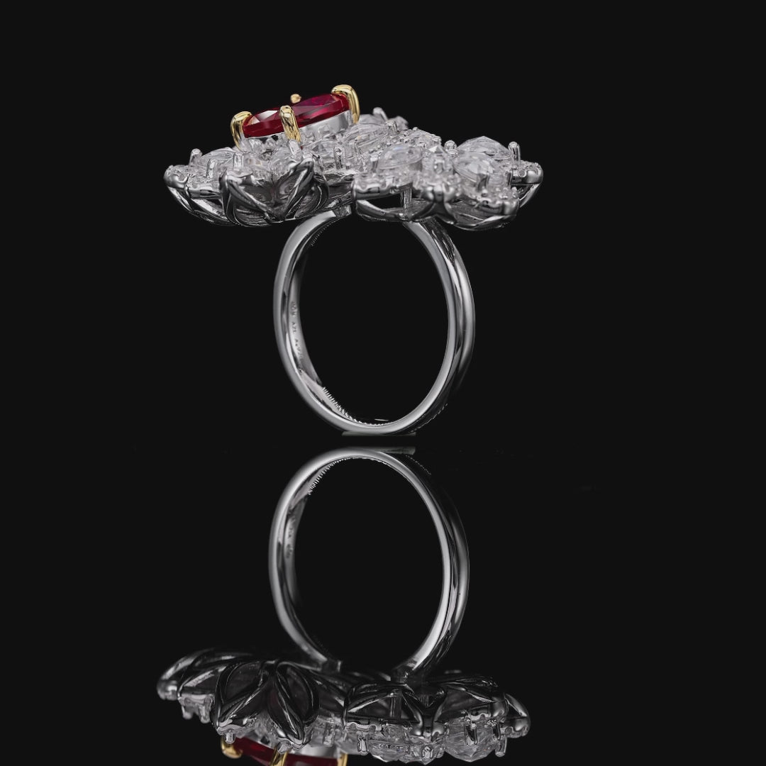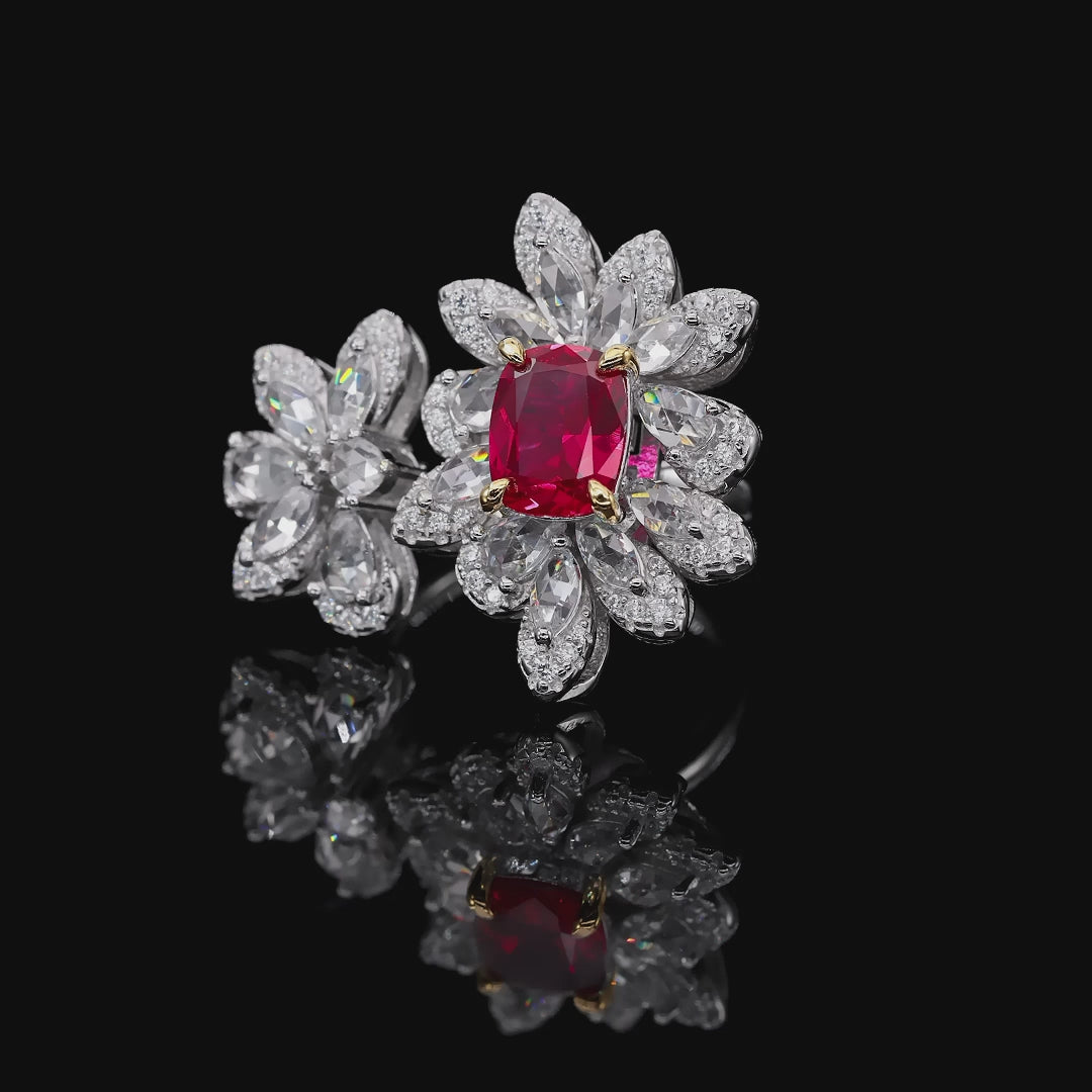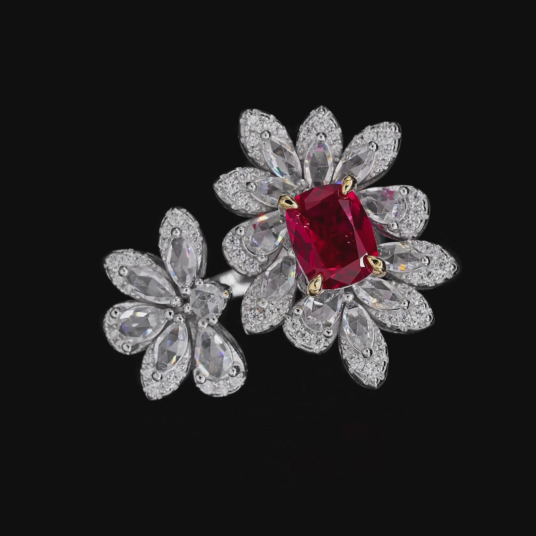 Introducing our exclusive Crimson Crown Bypass Ring featuring a 2-carat cushion cut red ruby surrounded by rose-cut diamond crystalline petals in an open-top design-- regal, sculptural, and striking from every angle.
