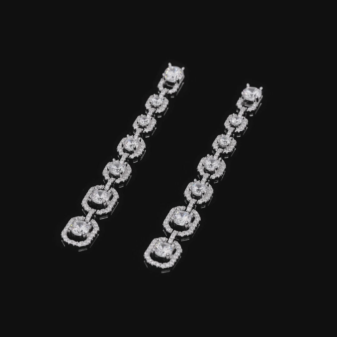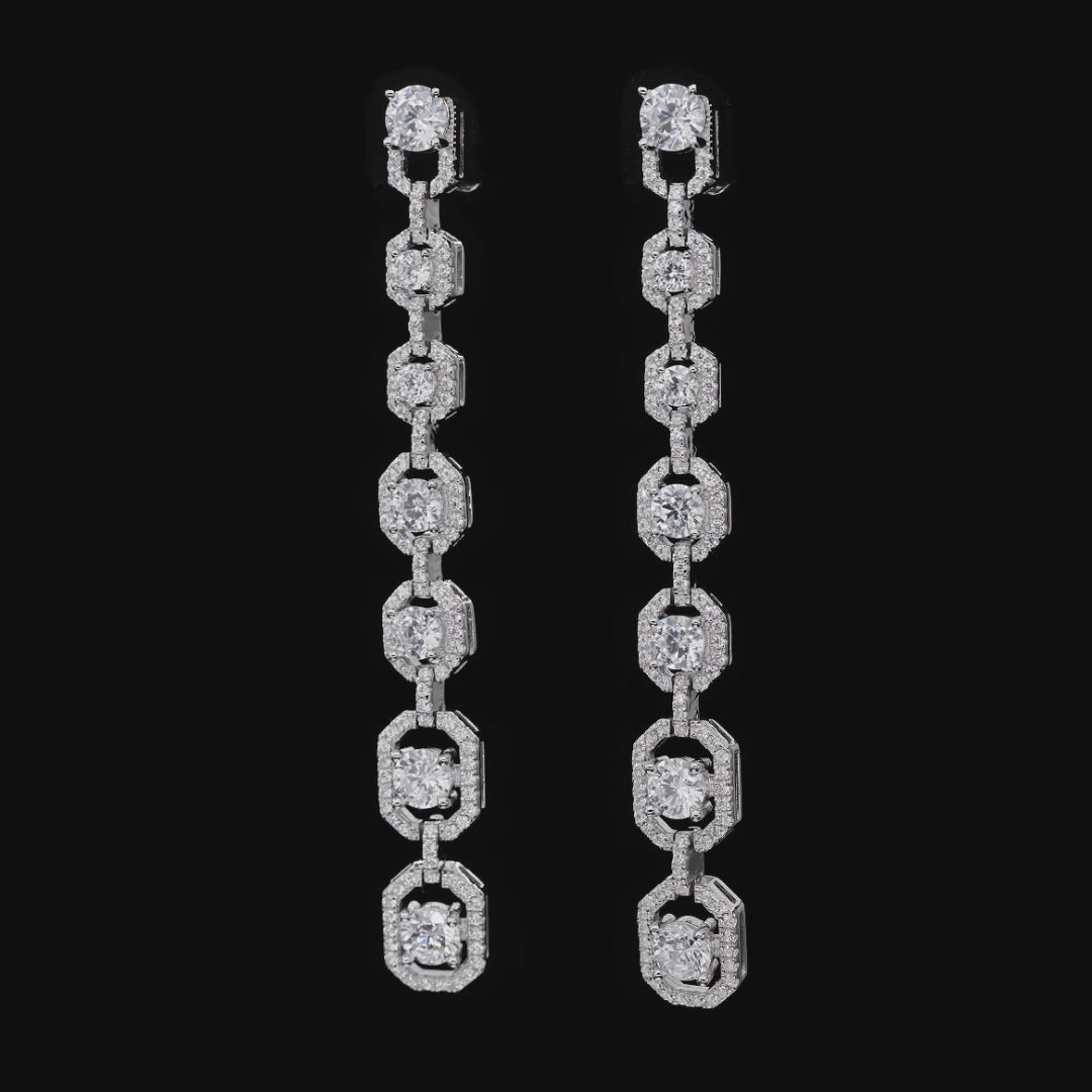 Elevate your style with these urban-chic Diamond Crystalline drop earrings, designed for a sleek 2-inch profile that exudes modern sophistication. Crafted in sterling silver with a choice of platinum, 18k rose, or yellow gold finish, these 4ctw earrings bring refined sparkle to any city-inspired look, perfect from brunch to nightlife.