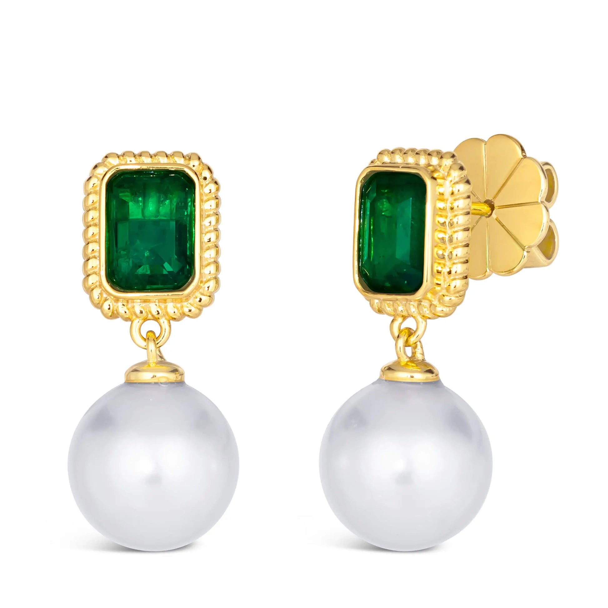 Discover the allure of our pearl drop earrings, featuring lustrous pearls and organic green emeralds atop. Perfect for daily wear or a weekend away, these earrings add a touch of class and sophistication to any ensemble.