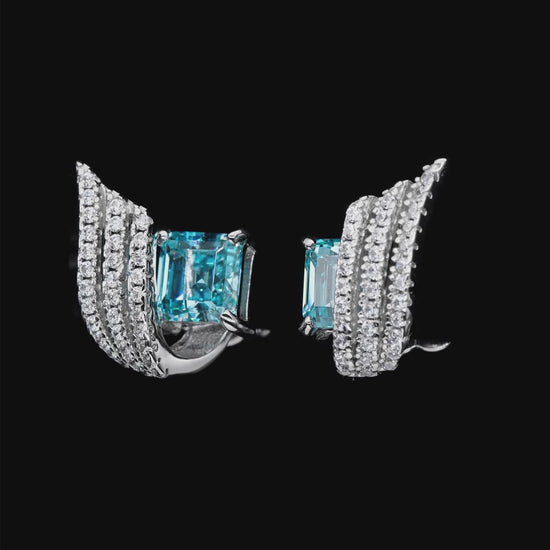 The Galleon Earrings in Aquamarine combine architectural elegance with luminous sparkle. Featuring emerald-cut aquamarine gems, each stone is accented by sculpted waves of pavé-set white diamond crystalline, creating a bold yet refined silhouette. Inspired by movement and strength, these earrings offer a modern statement with timeless appeal.