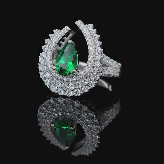 Discover elevated glamour with the High Society Ring in Emerald, a striking statement piece designed to command attention. Featuring a vivid emerald pear-cut center stone, the elegant setting is framed by a dramatic crescent of shimmering crystalline accents that capture light from every angle.