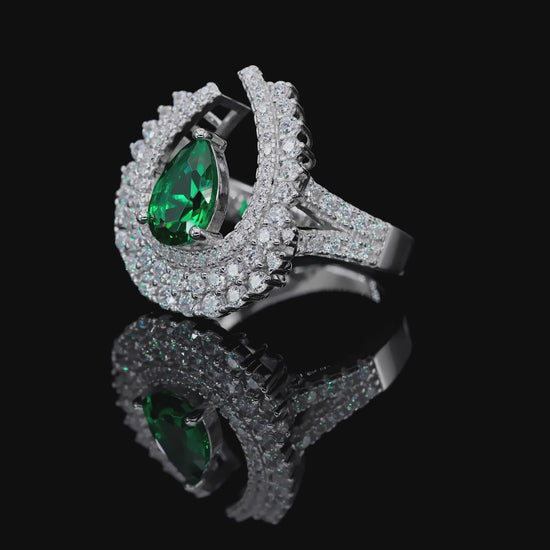 Discover elevated glamour with the High Society Ring in Emerald, a striking statement piece designed to command attention. Featuring a vivid emerald pear-cut center stone, the elegant setting is framed by a dramatic crescent of shimmering crystalline accents that capture light from every angle.