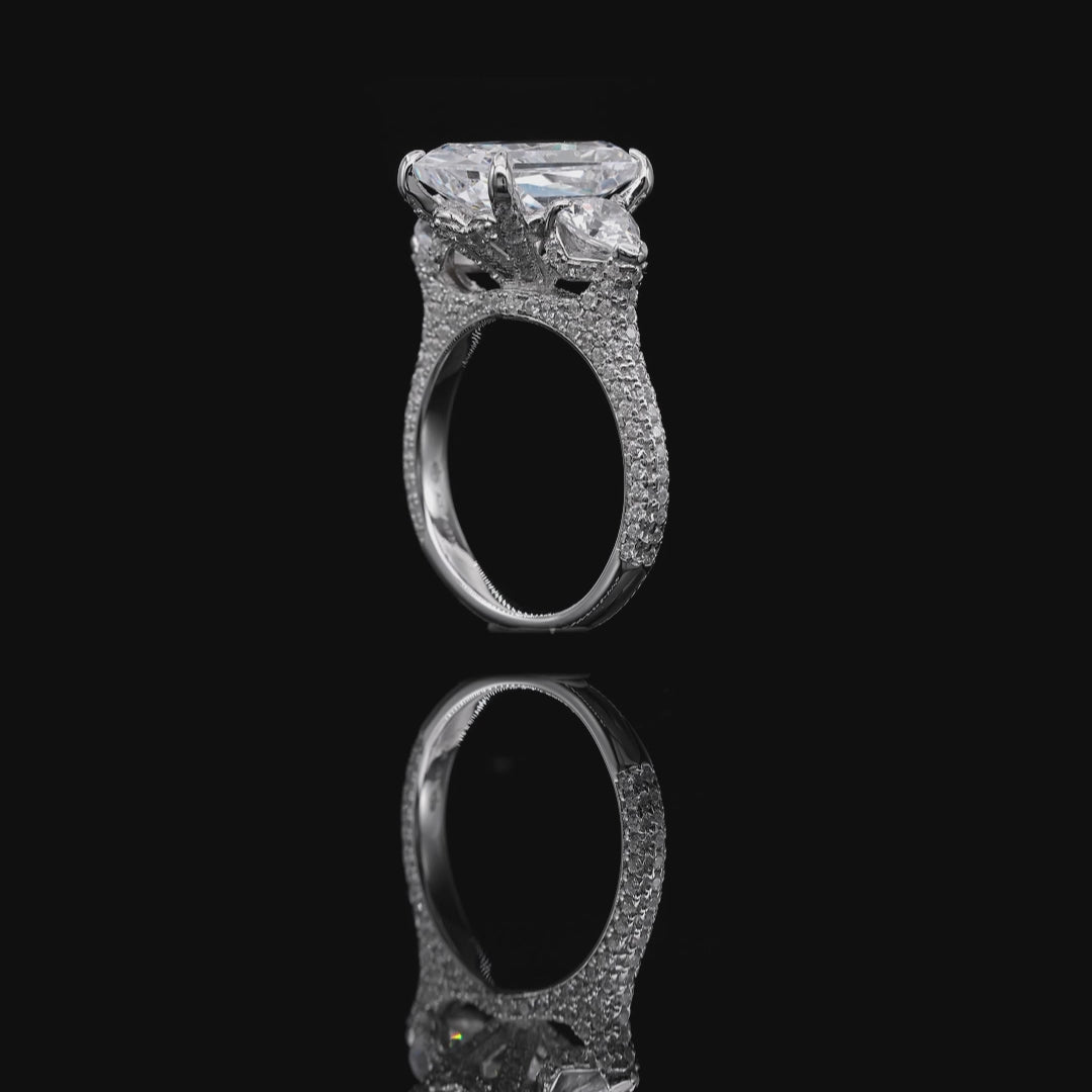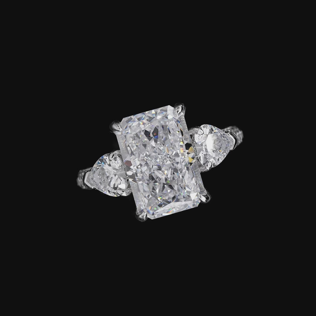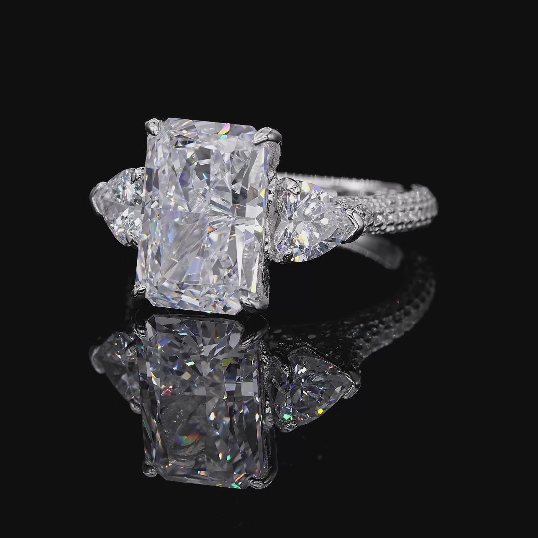 Embrace timeless elegance with our vintage-inspired three stone diamond crystalline ring, featuring our flawless radiant cut center stone and complemented by sparkling stones for a stunning, romantic touch.