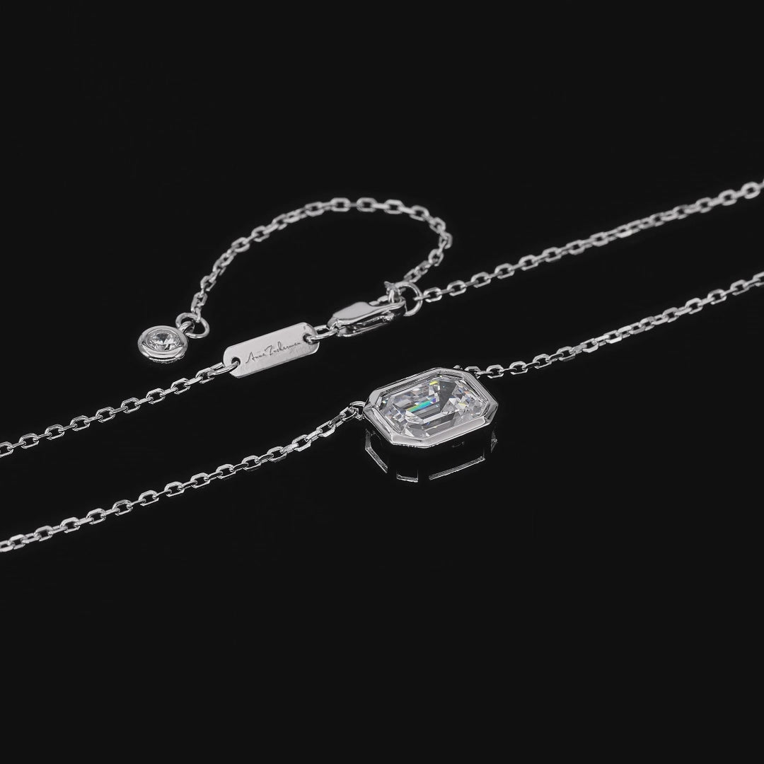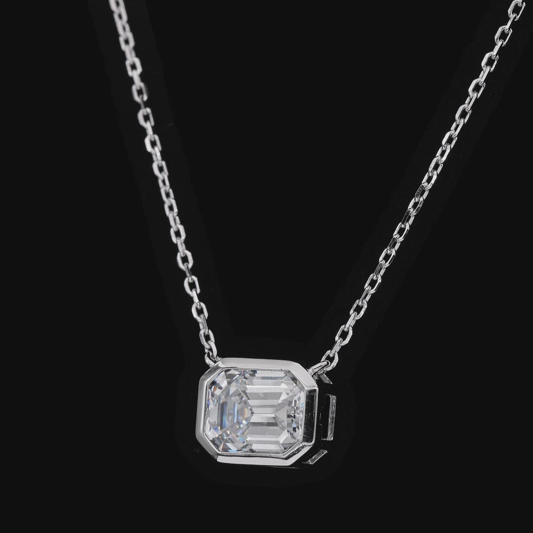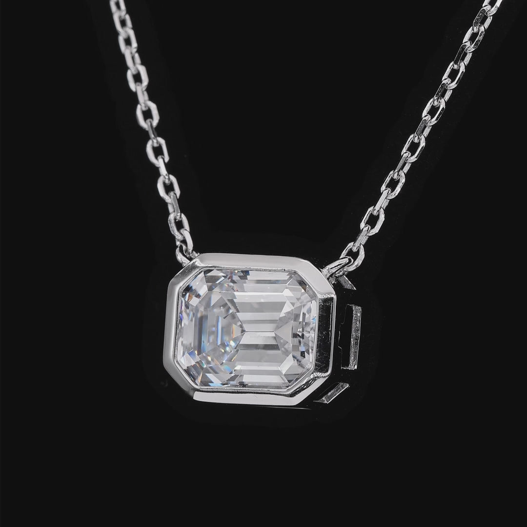 Elegant and sophisticated emerald cut diamond crystalline pendant on a delicate chain, set in a sleek bezel for a timeless and classic look.