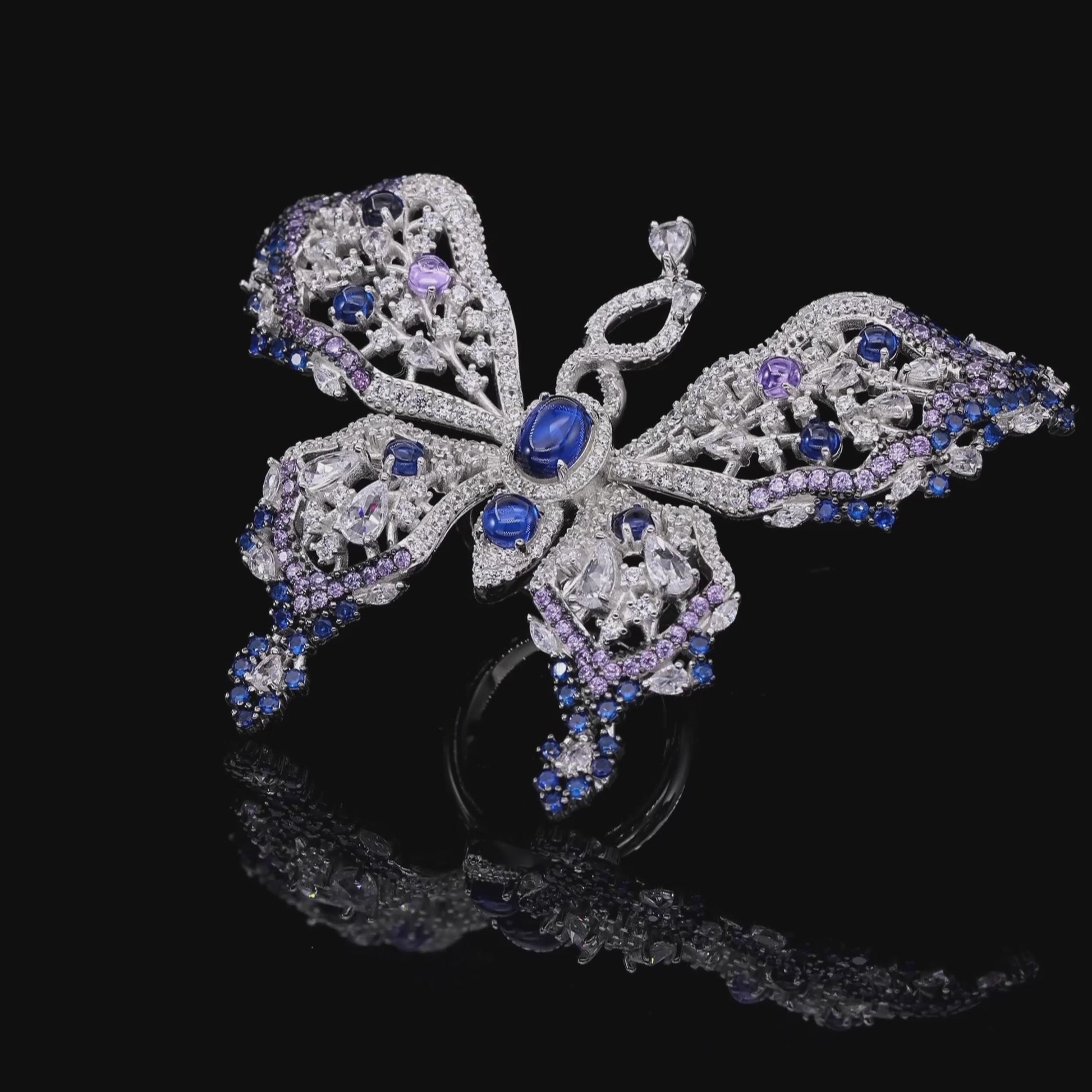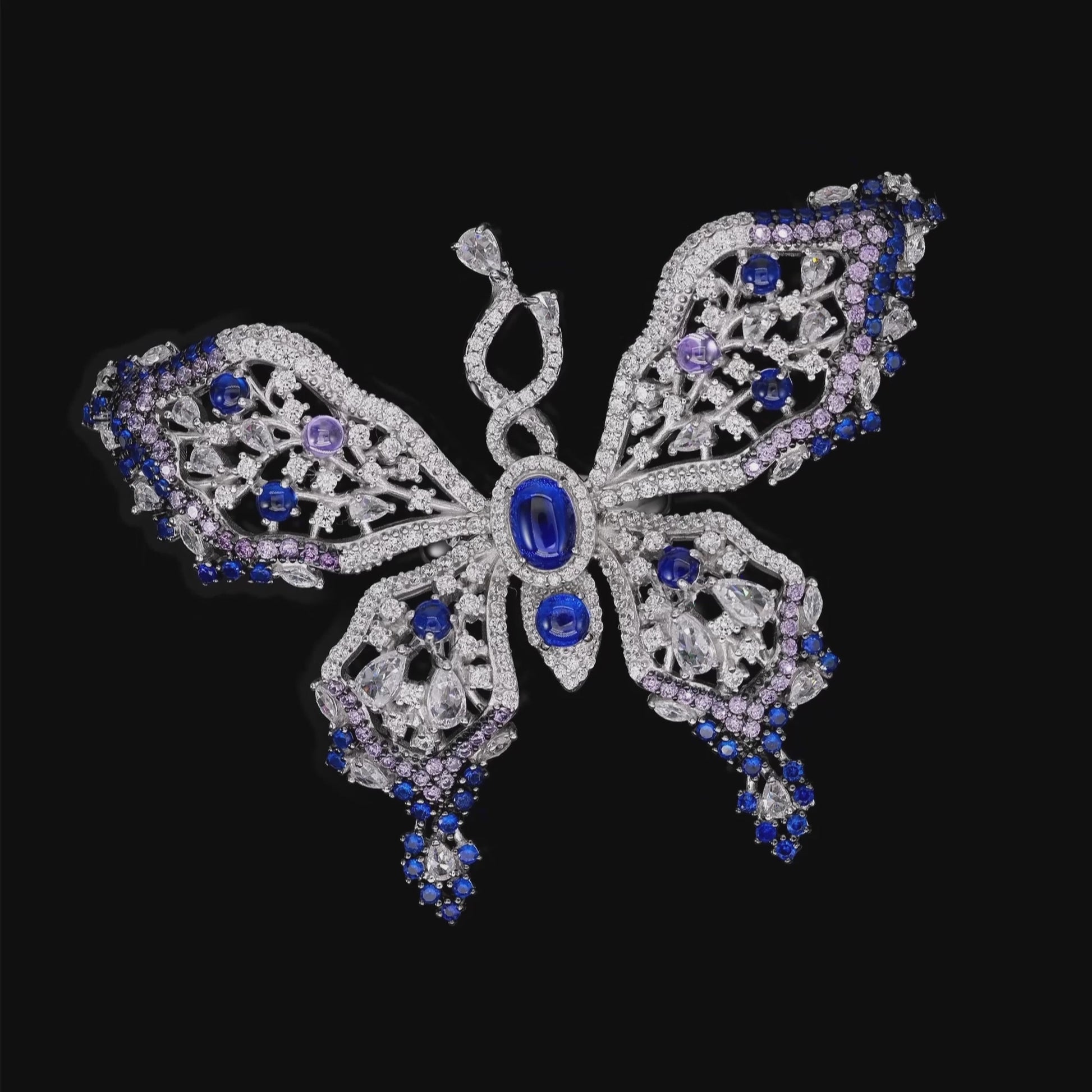 Flutters with romance -- an artfully sculpted butterfly adorned in vivid tanzanite and blue sapphires, its wings delicately dusted with diamond crystalline for a graceful enchanting statement.