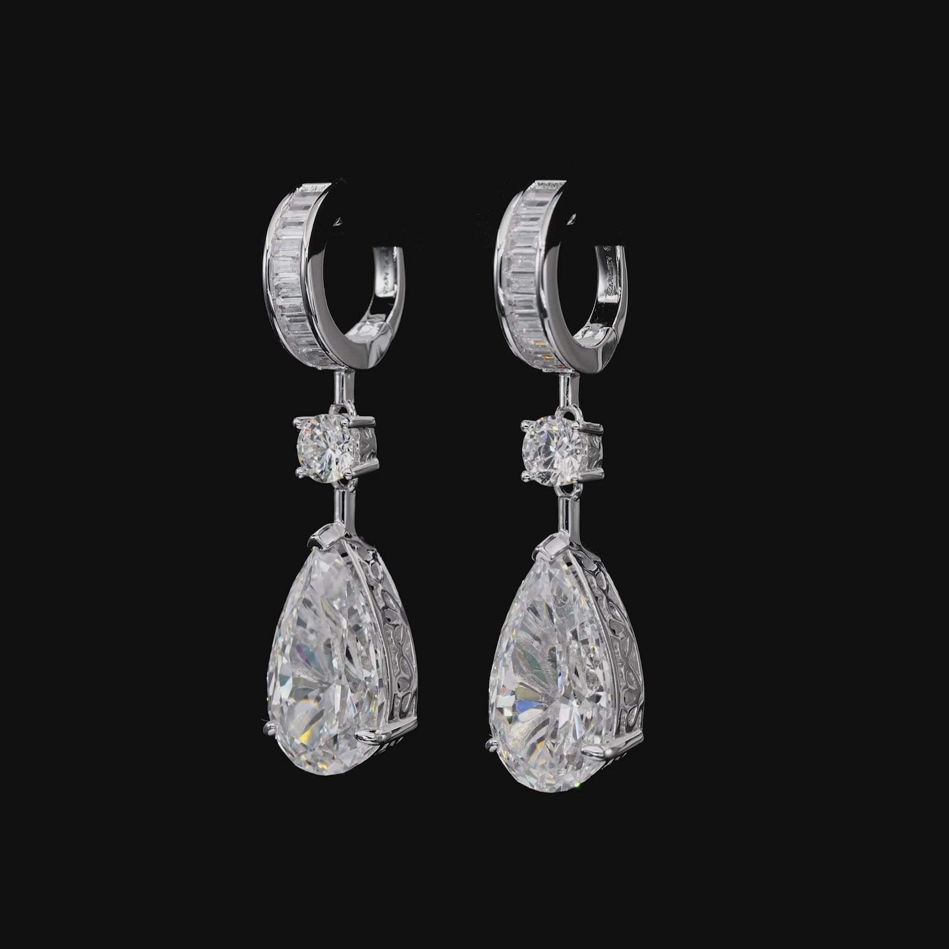 Elegant drop earrings featuring pear-shaped white diamond crystalline, suspended from a brilliant round accent and finished with a baguette-set huggie hoops in platinum-finished sterling silver--graceful, vibrant, and unforgettable.