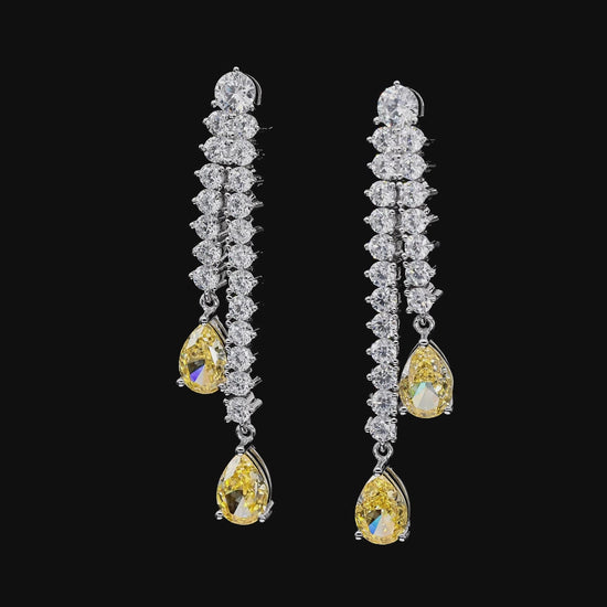 Discover the captivating elegance of the Marisol Drop Earrings, part of the exclusive Kathy Hilton Collection by Anna Zuckerman. Designed to shimmer with every movement, these graceful drops feature radiant yellow pear-cut diamond crystallines suspended beneath a cascade of sparkling white diamond crystallines. Crafted to elongate the silhouette and capture timeless glamour, this refined statement piece blends classic sophistication with modern luxury—perfect for evening events, celebrations, and elevated everyday style.