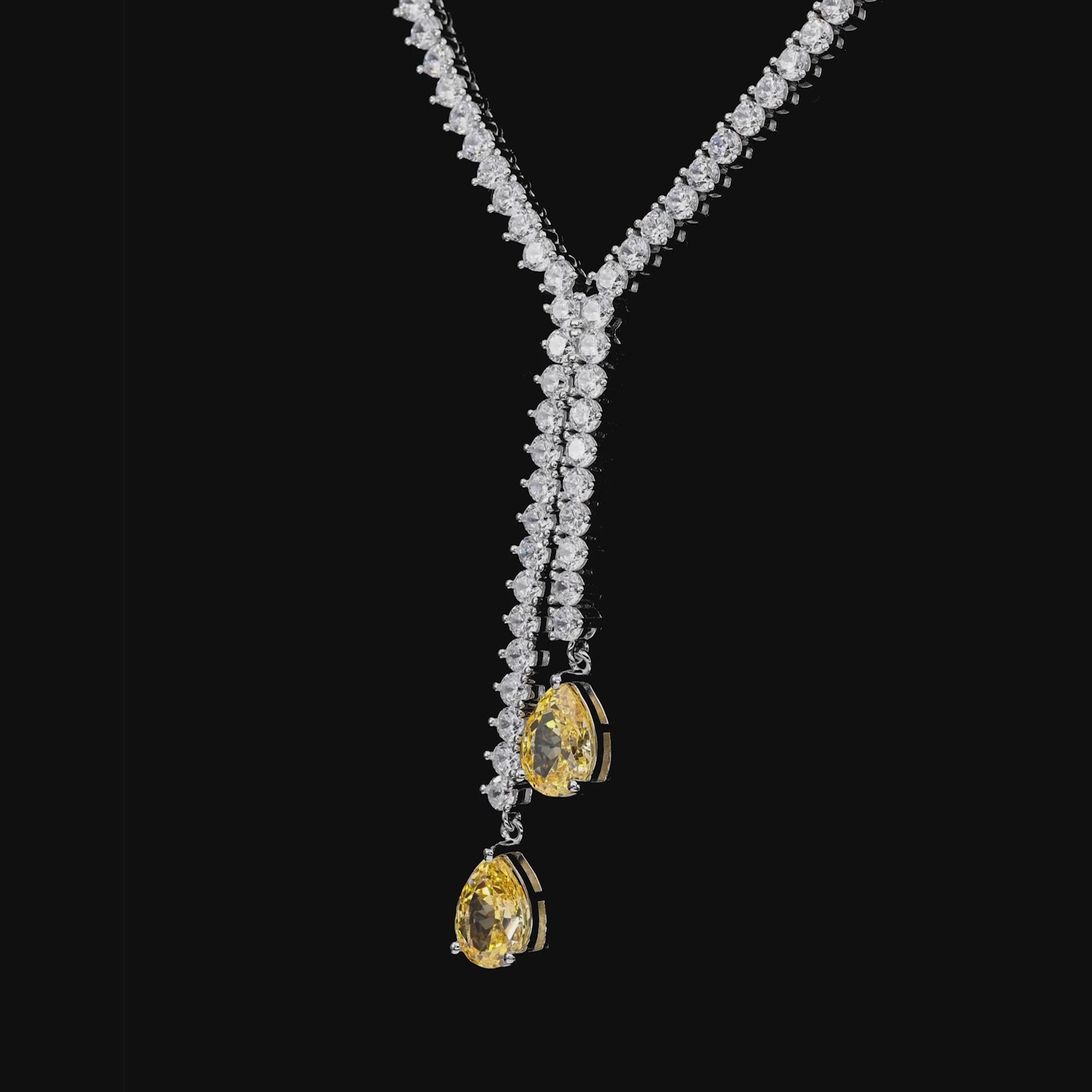 Discover captivating elegance with the Marisol Drop Necklace part of the exclusive Kathy Hilton Collection by Anna Zuckerman. A continuous strand of brilliant white diamond crystallines gracefully frames the neckline, cascading into a dramatic drop adorned with radiant yellow pear-cut diamond crystallines.
