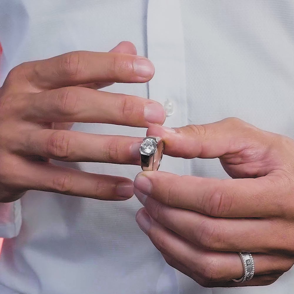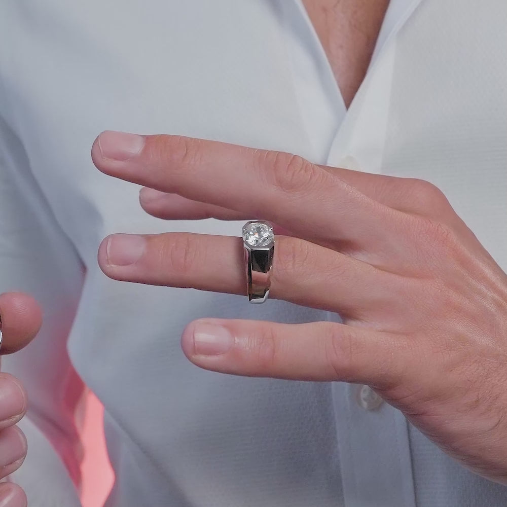 Discover our men's collection, featuring this stunning diamond crystalline band, showcasing a flawless GH color diamond infused center stone. This refined piece exudes strength and elegance, making it the ideal statement for a modern man.