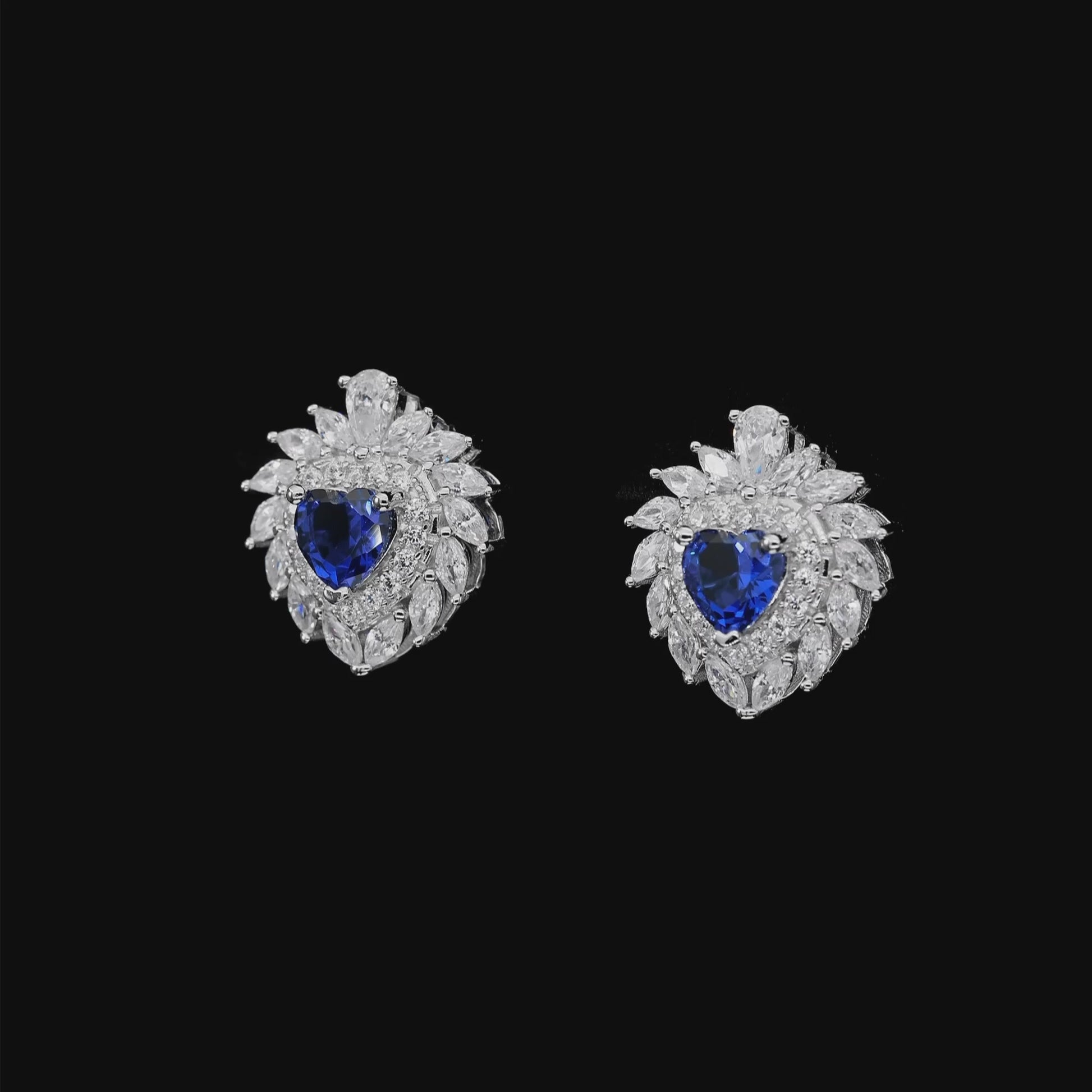 Striking elegance with a royal touch, the Multi Gem Heart Earrings in Sapphire showcase a deep blue heart-shaped sapphire crystalline at the center, surrounded by an opulent halo of marquise and round white diamond crystalline gems. The intricate, floral-inspired design creates exceptional brilliance and dimension, making these earrings a true statement of luxury—perfect for evening wear, special occasions, or whenever you want to stand out with timeless sophistication.