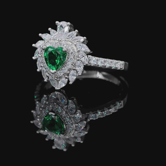 Striking elegance with a royal touch, the Multi Gem Heart Ring in Emerald showcase a deep green heart-shaped emerald crystalline at the center, surrounded by an opulent halo of marquise and round white diamond crystalline gems. The intricate, heart-inspired design creates exceptional brilliance and dimension, making this ring a true statement of luxury—perfect for evening wear, special occasions, or whenever you want to stand out with timeless sophistication.