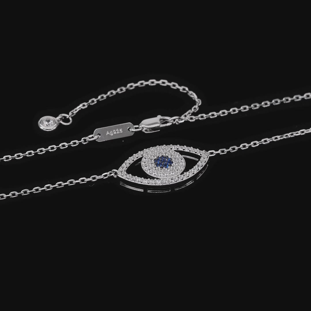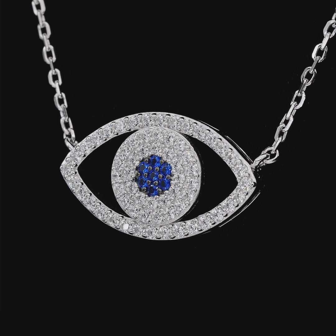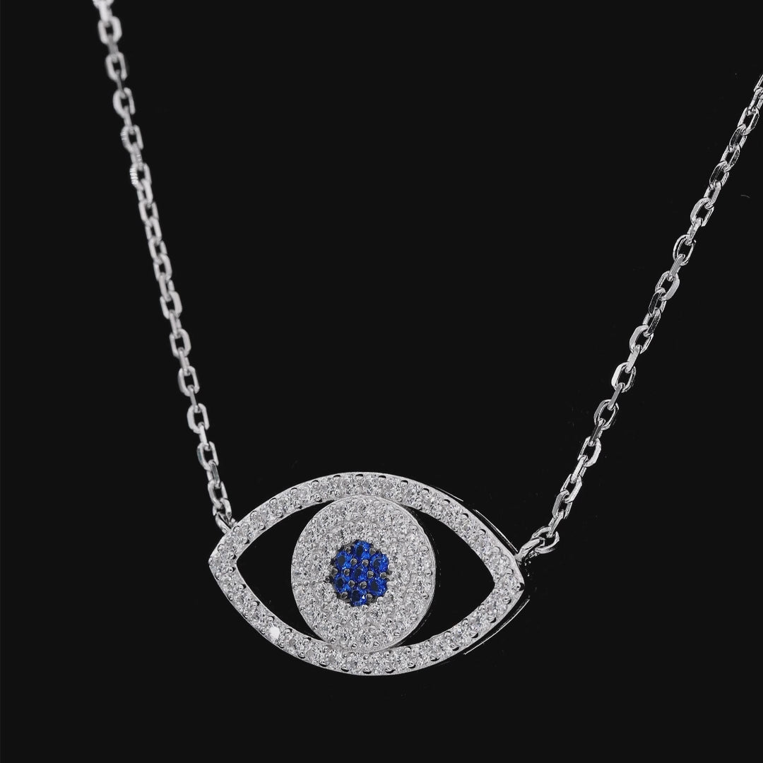 Combining mysticism and modern style, the Kathy Hilton Evil Eye Necklace features Pave Sapphire Blue and White Diamond Crystalline stones. With a Platinum finish, it’s both symbolic and chic.