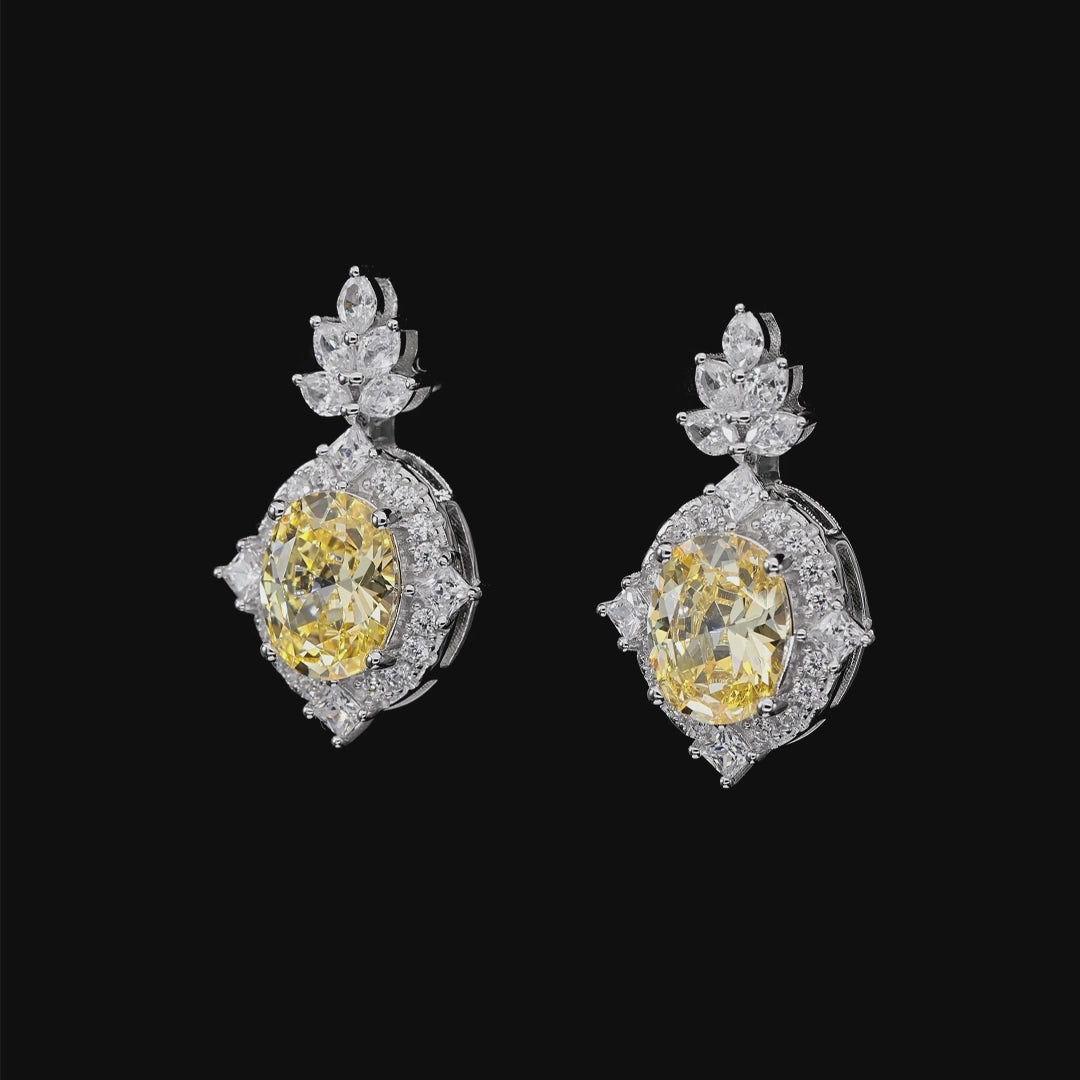 The Santana Drops in Canary Yellow are a luminous statement of refined glamour. Featuring a canary yellow oval-cut center stone framed in delicate pavé sparkle and crowned with an elegant marquise-inspired detail, these earrings radiate timeless sophistication. Designed to catch the light from every angle, they bring effortless brilliance to both evening occasions and elevated everyday styling.