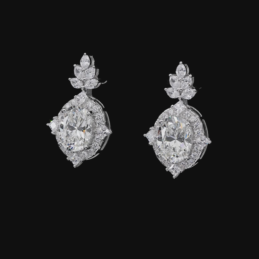 The Santana Drops in White Diamond are a luminous statement of refined glamour. Featuring a white diamond oval-cut center stone framed in delicate pavé sparkle and crowned with an elegant marquise-inspired detail, these earrings radiate timeless sophistication. Designed to catch the light from every angle, they bring effortless brilliance to both evening occasions and elevated everyday styling.