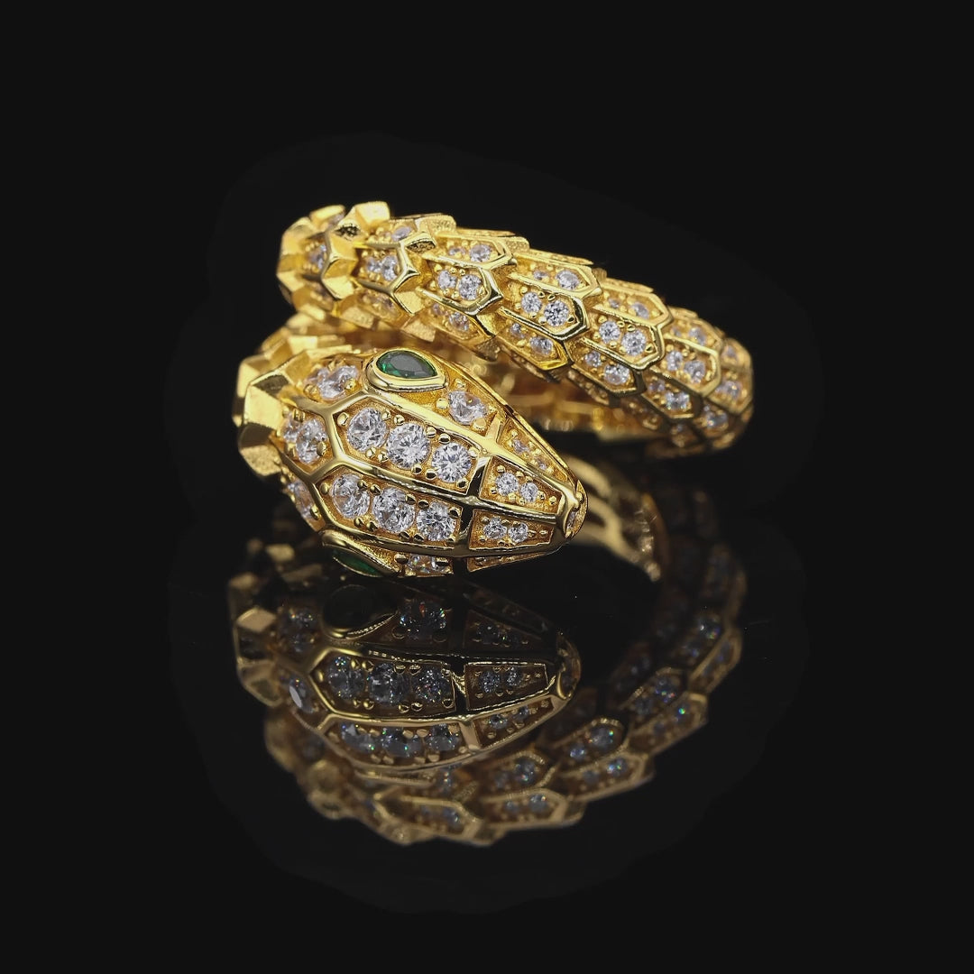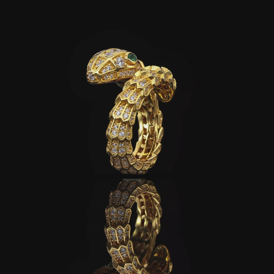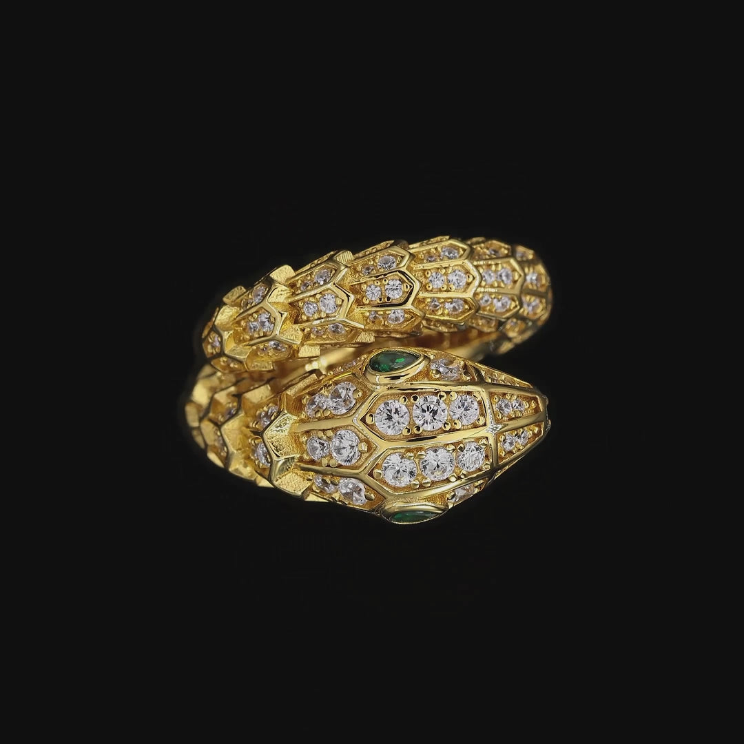 Fierce and luxurious, this 18K gold vermeil snake ring coils elegantly around the finger, shimmering with diamond crystalline scales and glowing emerald-green eyes. A bold symbol of power and allure.