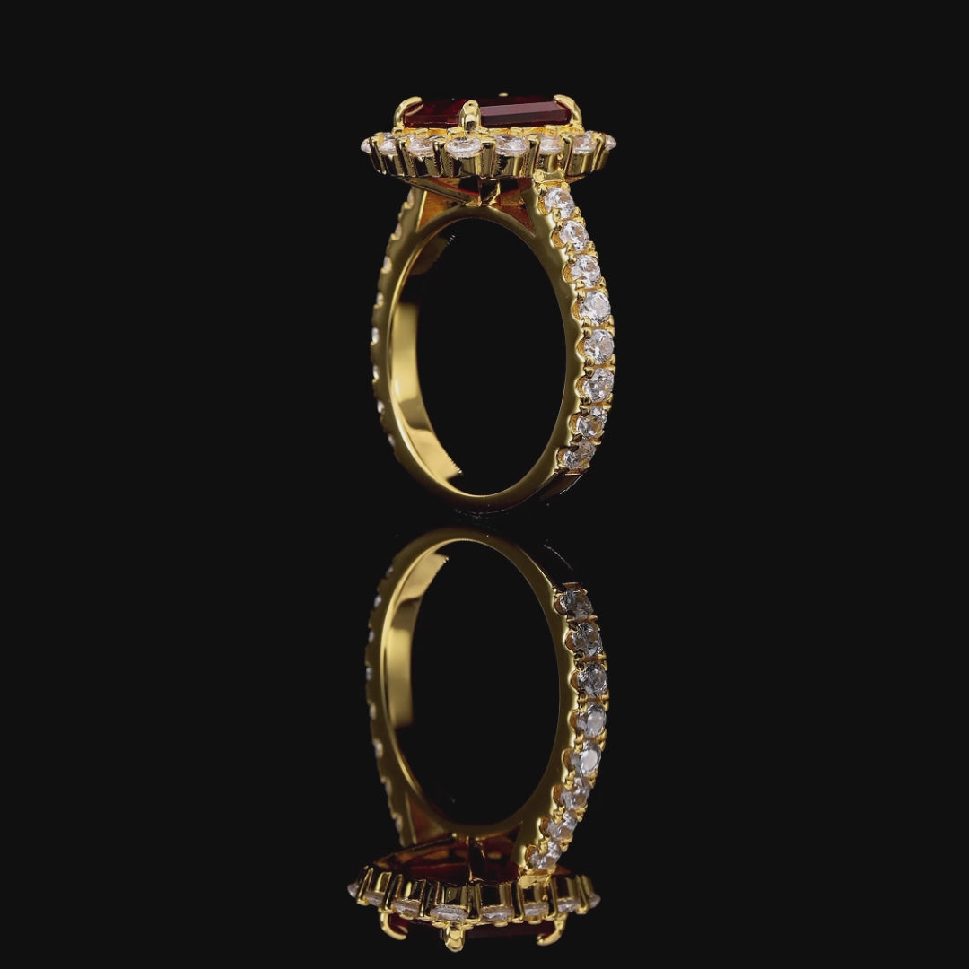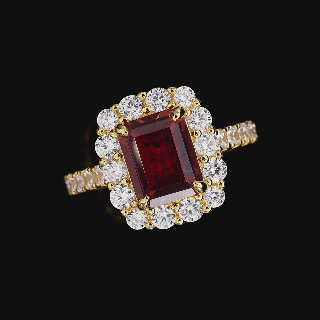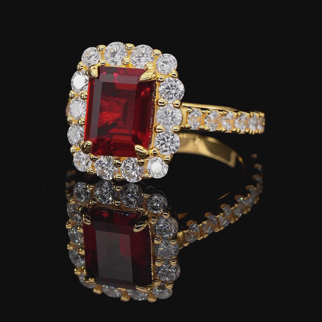 This elegant cocktail ring features an emerald cut ruby surrounded by sparkling diamond crystalline stones, set in 18K yellow gold-finished sterling silver. A stunning statement for any occasion.