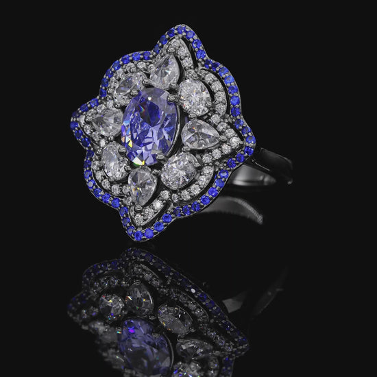 Bold, radiant, and exquisitely detailed, this statement Stella Reign Ring captures the beauty of fine craftsmanship with a captivating floral-inspired design. At its center sits a brilliant tanzanite stone, surrounded by layers of shimmering accents and delicate blue details that create depth, sparkle, and a truly luxurious presence.