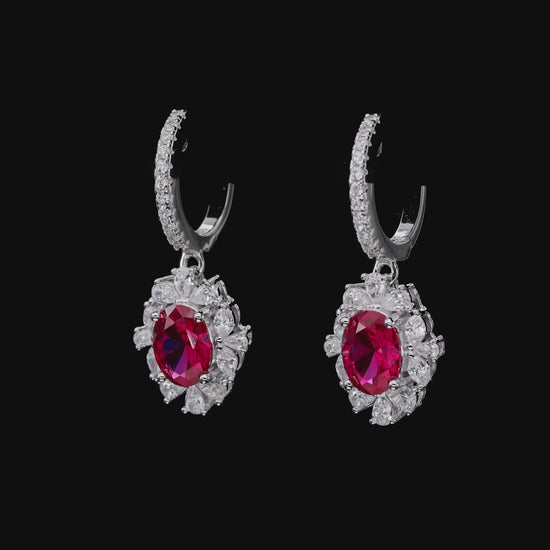 Elegant and captivating, the Tu Tu Tango Earrings in Ruby showcases a deep oval-cut ruby diamond crystalline framed by a radiant halo of marquise and round white diamond gems. Inspired by the grace and intensity of dance, this timeless design delivers classic sophistication with a bold, modern edge—perfect for both everyday elegance and evening glamour.