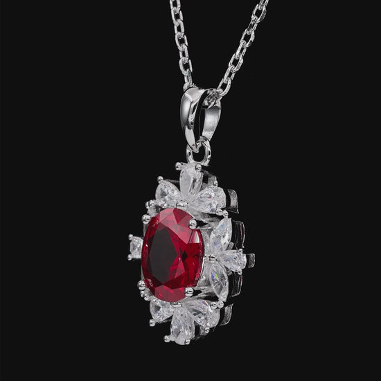 Bold, romantic, and full of passion, the Tu Tu Tango Necklace in Ruby features a striking oval-cut ruby diamond crystalline at its center, framed by an elegant halo of marquise and round white diamond gems. Inspired by the rhythm and drama of dance, this design radiates confidence and timeless glamour—perfect for making a statement day or night.
