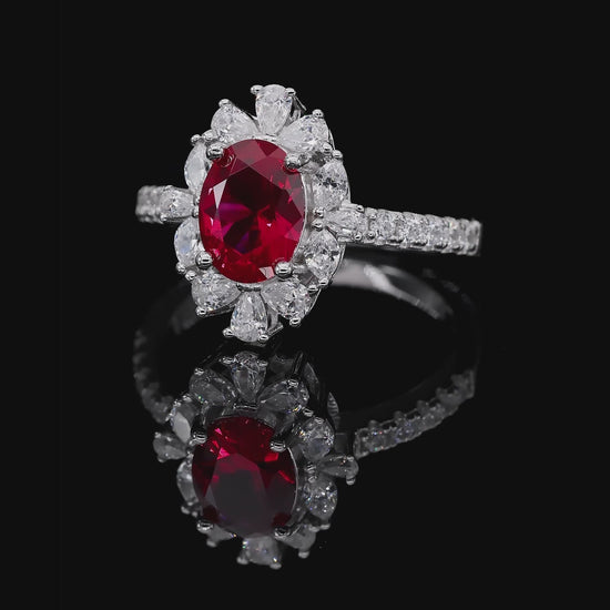 Elegant and captivating, the Tu Tu Tango Ring in Ruby brings graceful brilliance to a refined silhouette. At its center, an oval-cut ruby crystalline is framed by a radiant halo of marquise and round stones, creating a balanced composition of light and movement. Inspired by the fluidity and intensity of dance, the design blends timeless sophistication with a confident modern presence.